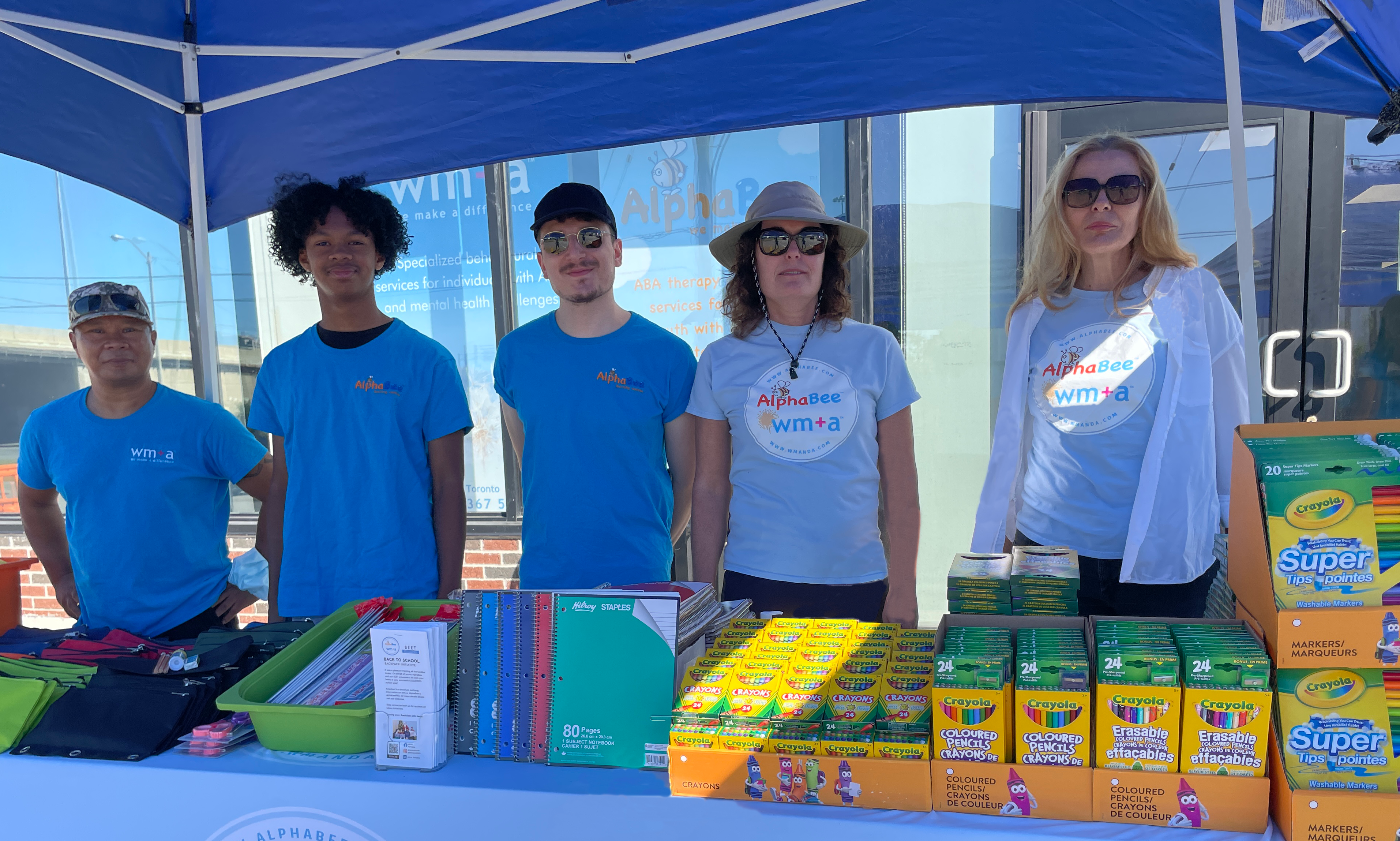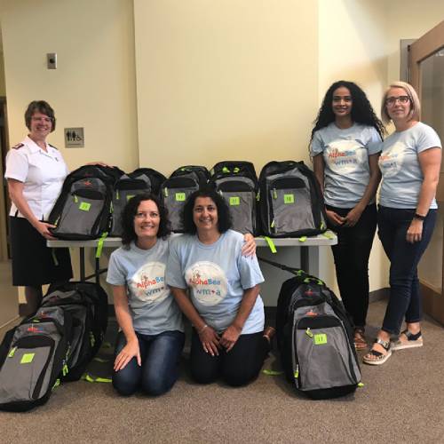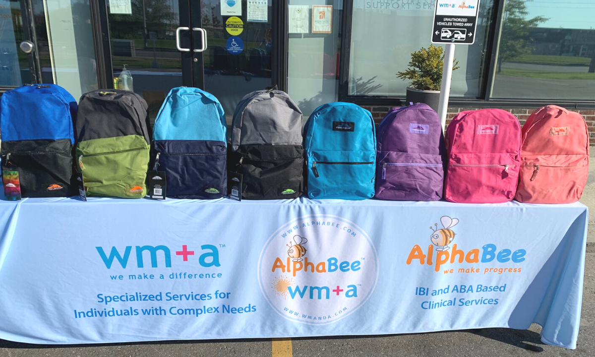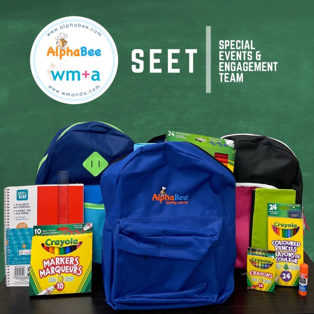 The goal was to provide 50 in-need children and youth in the community each with a backpack filled with much needed back to school supplies. Each backpack contained a variety of items including: pens, pencils, crayons, markers, pencil crayons, glue sticks, a ruler, a binder filled with paper, a notebook, a squeeze ball, and a wm+a/AlphaBee t-shirt.